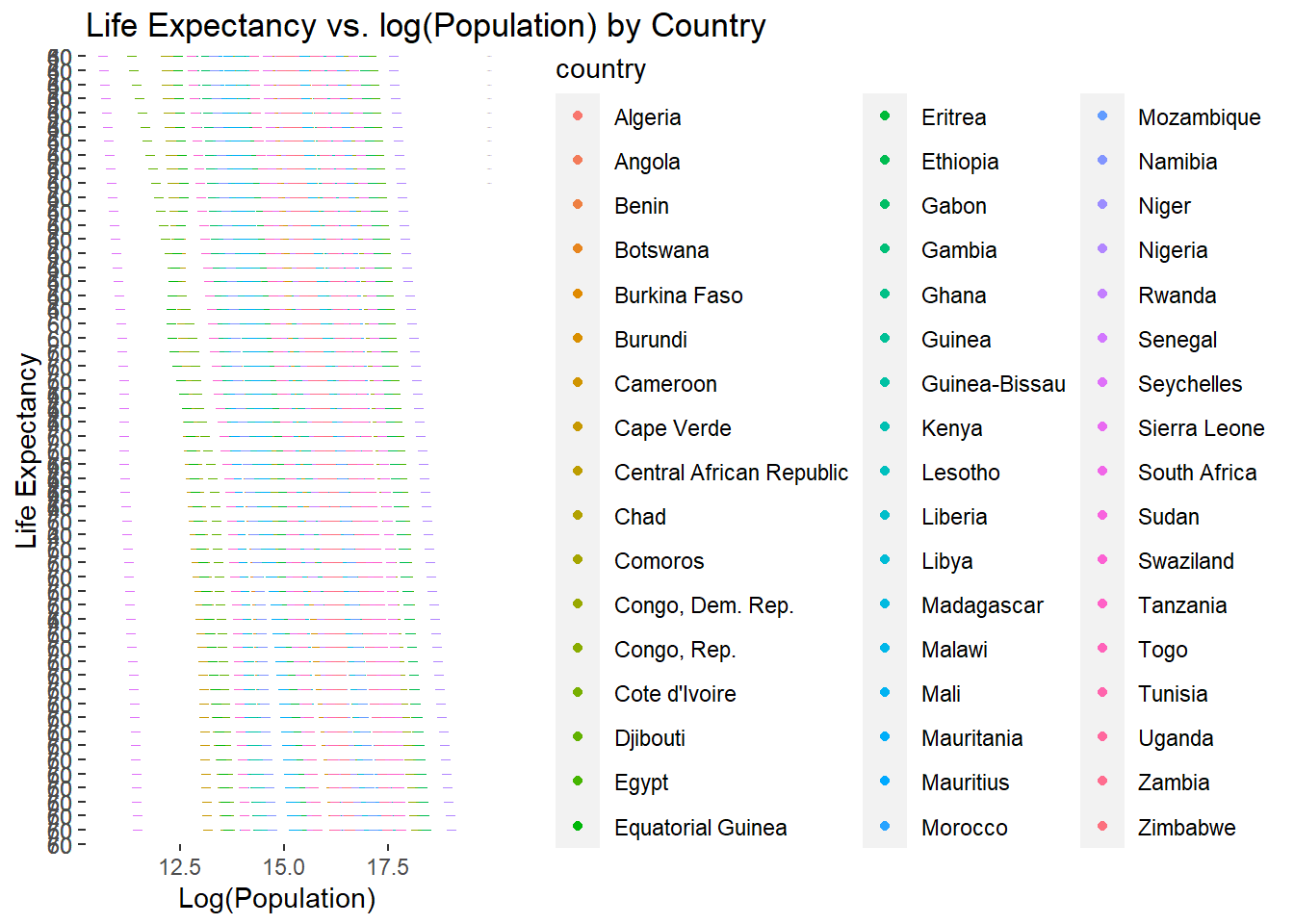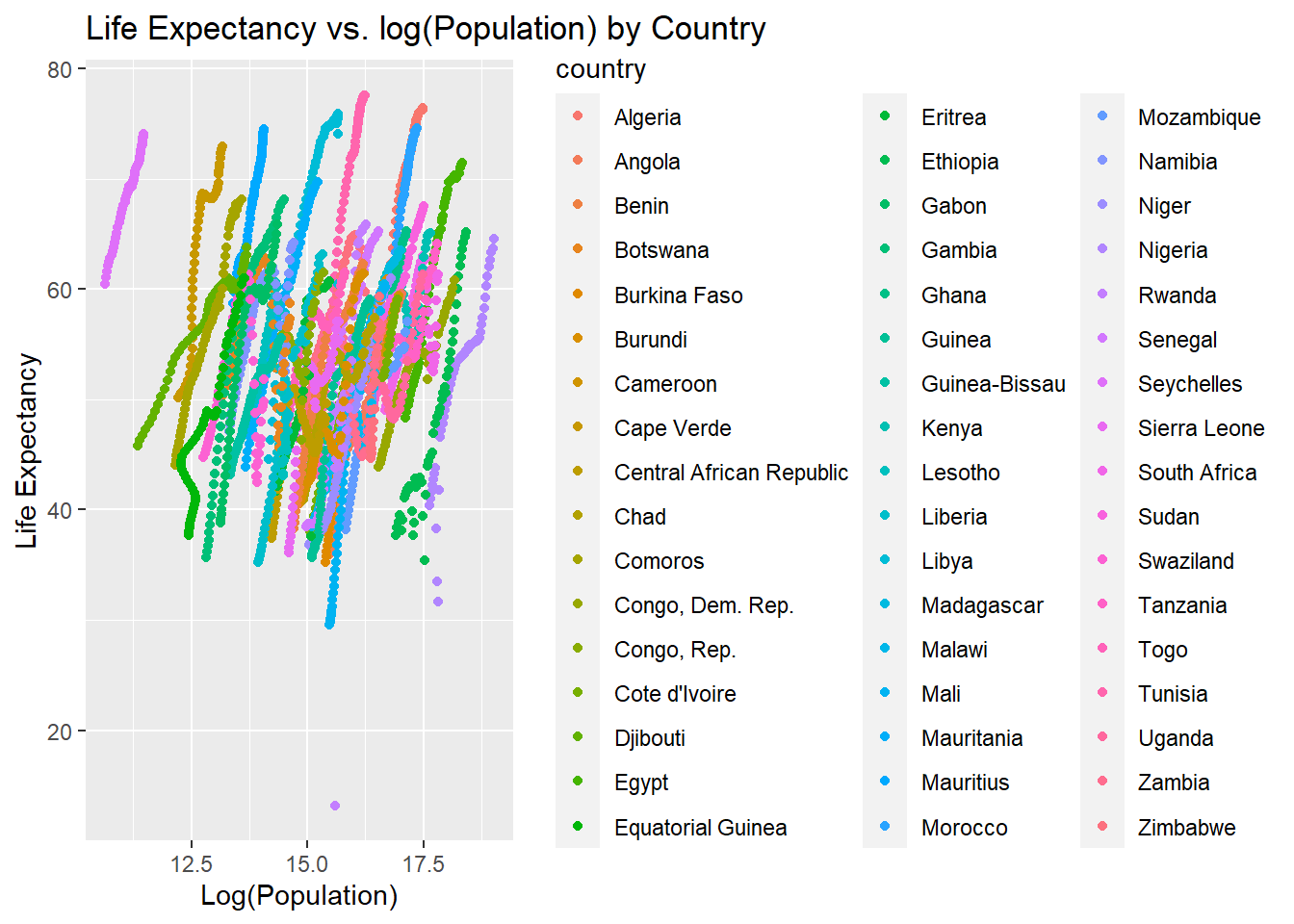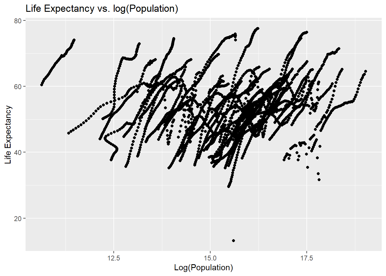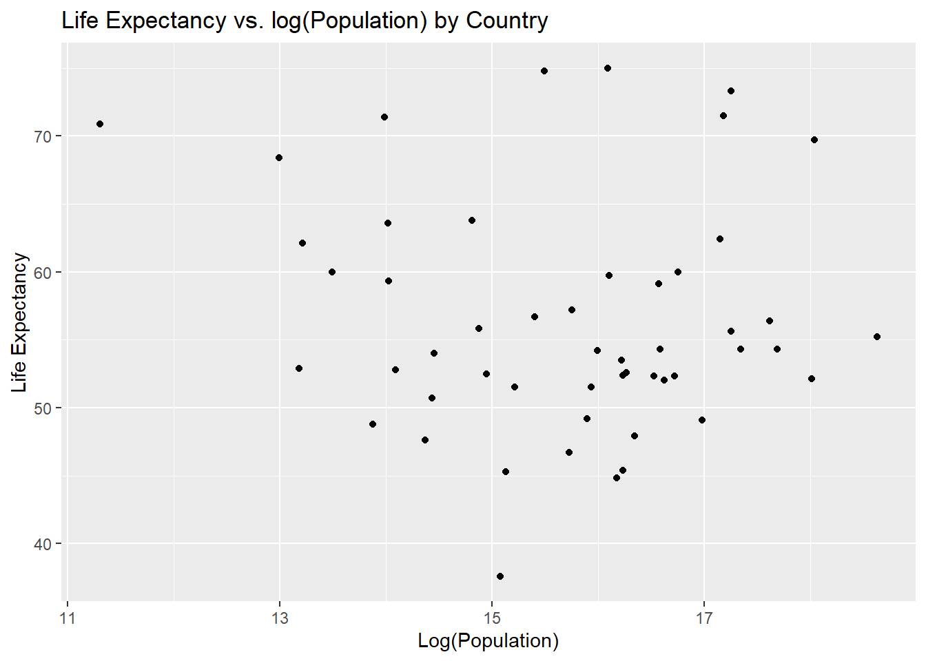 lifevpop_plot4 <-ggplot(d4, aes(x =log(population), y = life_expectancy)) +geom_point() +labs(title ="Life Expectancy vs. log(Population) by Country",x ="Log(Population)",y ="Life Expectancy")print(lifevpop_plot4)