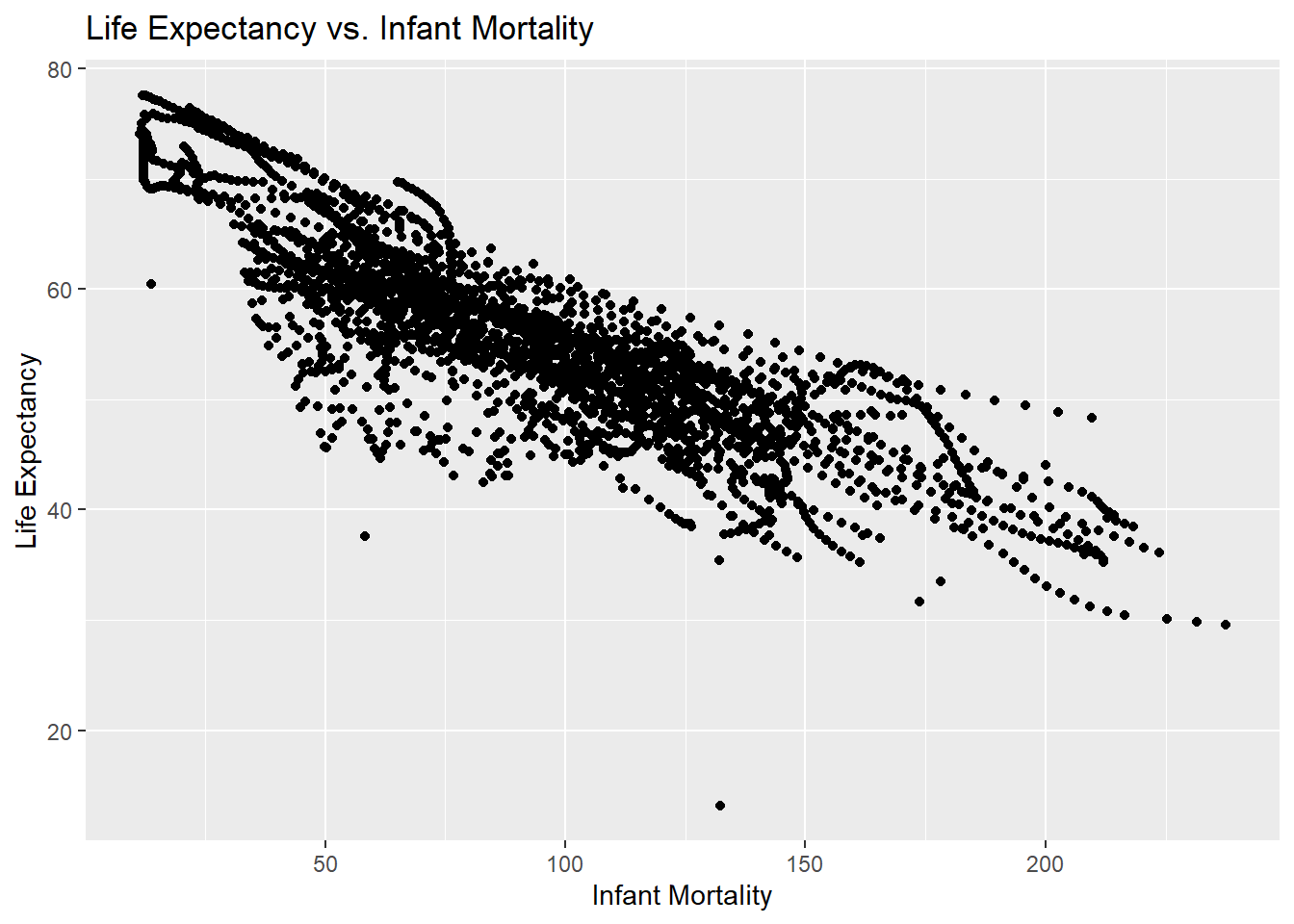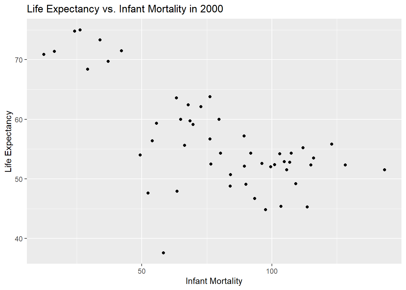 lifevim_plot6 <-ggplot(d4, aes(x = infant_mortality, y = life_expectancy)) +geom_point() +labs(title ="Life Expectancy vs. Infant Mortality in 2000",x ="Infant Mortality",y ="Life Expectancy")print(lifevim_plot6)