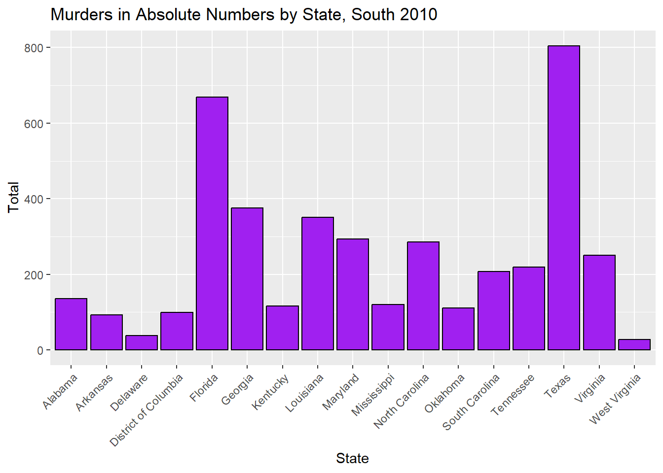 #Plotting#Creating a bar plot of murders in absolute numbers in the South by state, 2010plot_7 <-ggplot(murders_data_south, aes(x = state, y = total)) +geom_bar(stat ="identity", fill ="purple", color ="black") +labs(title ="Murders in Absolute Numbers by State, South 2010",x ="State",y ="Total") +theme(axis.text.x =element_text(angle =45, hjust =1))#Displayingprint(plot_7)