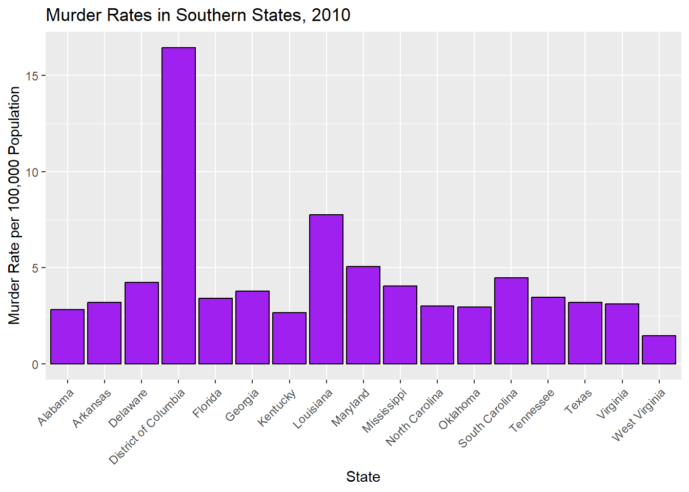 # Calculating murder rate (total murders per 100,000 population)murders_data_south$rate <- (murders_data_south$total / murders_data_south$population) *100000#Creating a bar plot of murder rates in the South by state, 2010plot_8 <-ggplot(murders_data_south, aes(x = state, y = rate)) +geom_bar(stat ="identity", fill ="purple", color ="black") +labs(title ="Murder Rates in Southern States, 2010",x ="State",y ="Murder Rate per 100,000 Population") +theme(axis.text.x =element_text(angle =45, hjust =1))#Displayingprint(plot_8)