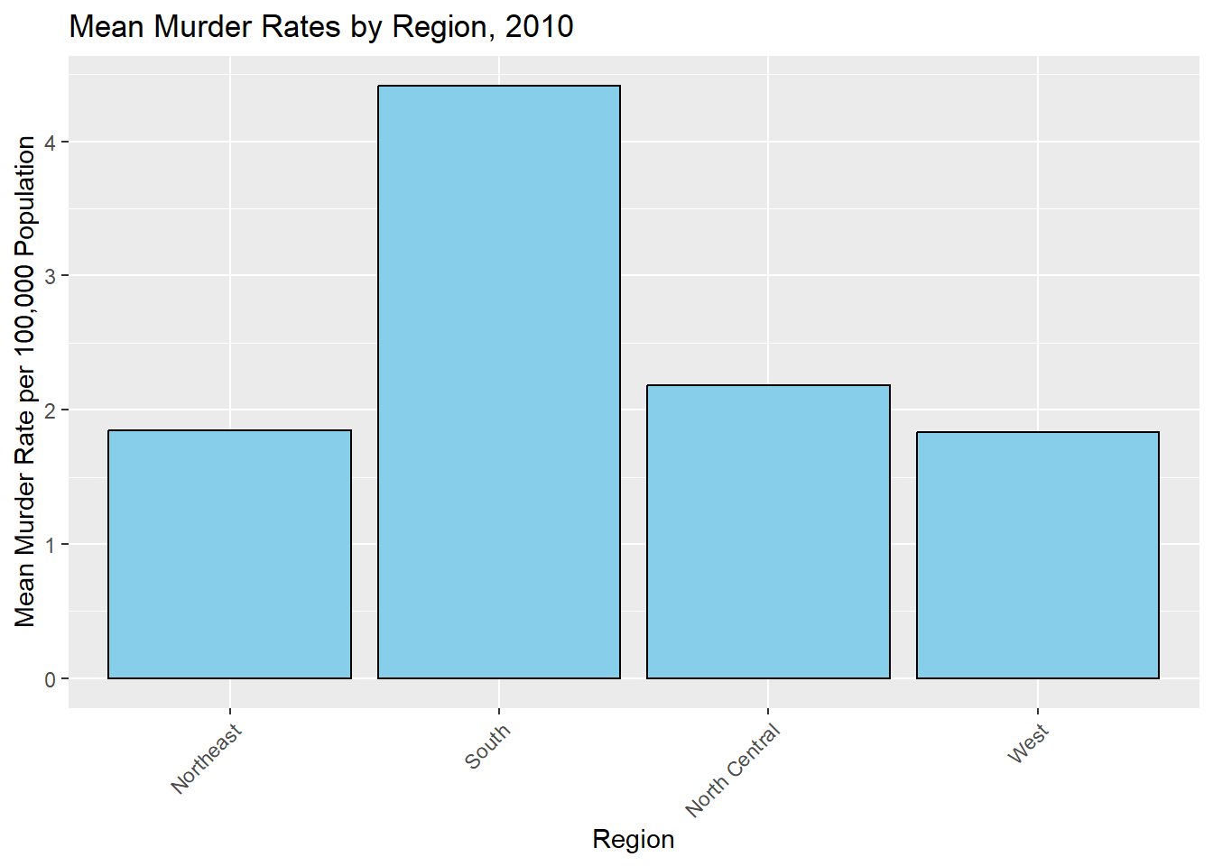 # Calculating murder rate (total murders per 100,000 population)murders$rate <- (murders$total / murders$population) *100000#Aggregating the data to get the mean murder rate for each region, 2010region_summary <-aggregate(rate ~ region, data = murders, FUN = mean)#Creating a bar plot of murder rates by region, 2010plot_9 <-ggplot(region_summary, aes(x = region, y = rate)) +geom_bar(stat ="identity", fill ="skyblue", color ="black") +labs(title ="Mean Murder Rates by Region, 2010",x ="Region",y ="Mean Murder Rate per 100,000 Population") +theme(axis.text.x =element_text(angle =45, hjust =1))#Displayingprint(plot_9)