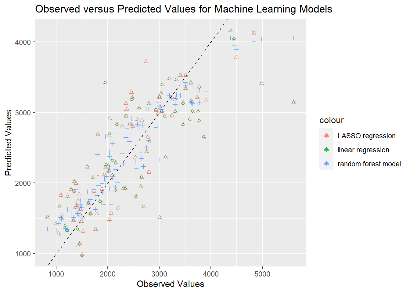 ## Create Plotggplot(plot_data, aes(x = observed)) +geom_point(aes(y = glm_predictions, color ="linear regression"), shape =1) +geom_point(aes(y = lasso_predictions, color ="LASSO regression"), shape =2) +geom_point(aes(y = rf_predictions, color ="random forest model"), shape =3) +geom_abline(slope =1, intercept =0, linetype ="dashed", color ="black") +#add the 45 degree linelabs(x ="Observed Values", y ="Predicted Values", title ="Observed versus Predicted Values for Machine Learning Models")