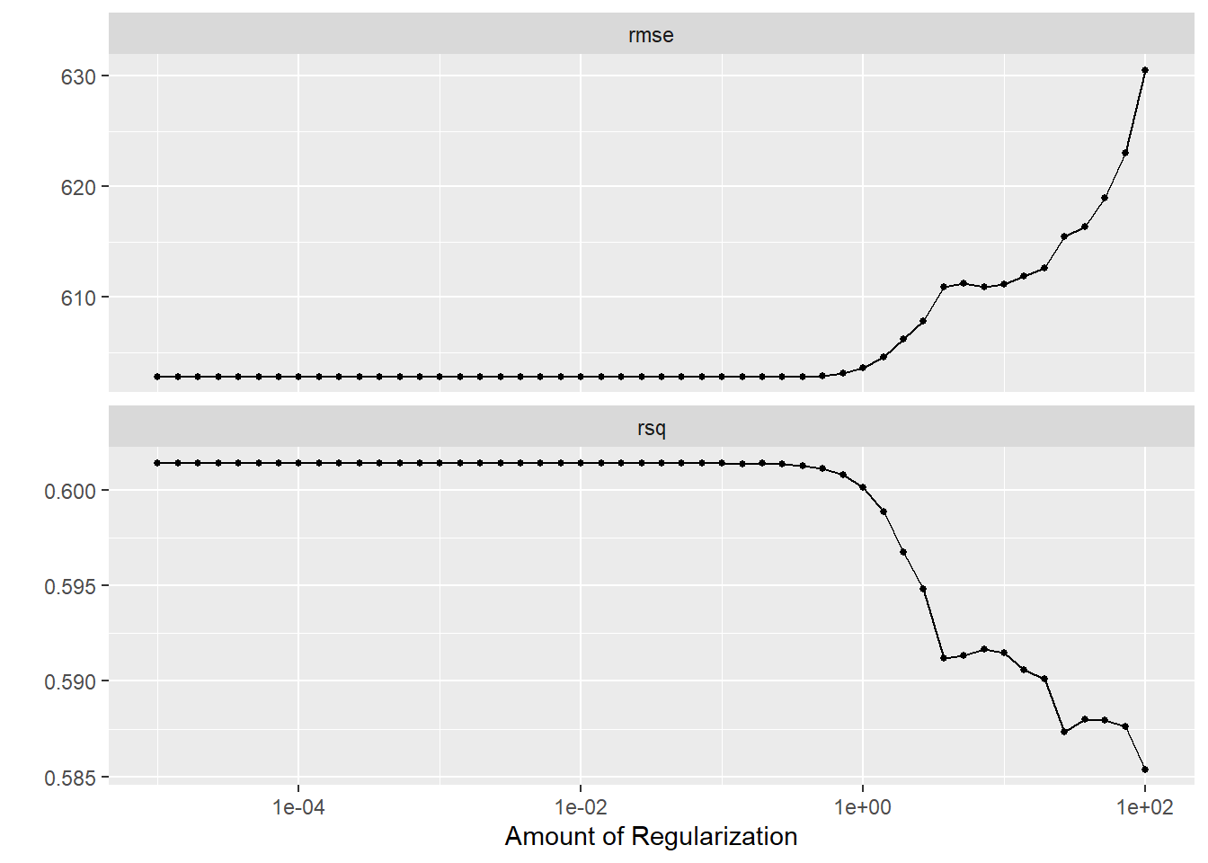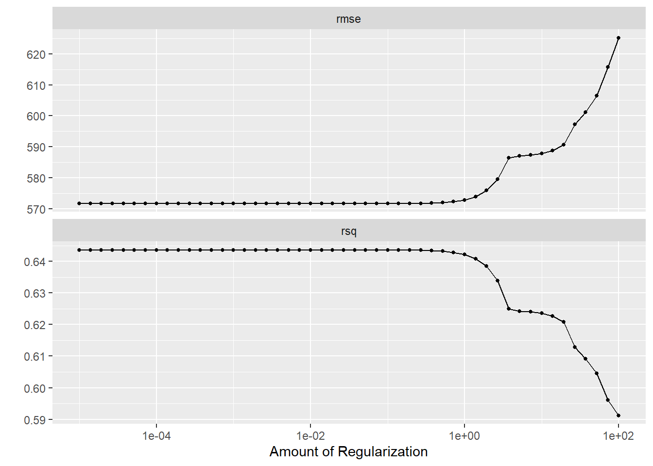 # LASSO tuninglasso_grid <-10^seq(-5, 2, length.out =50) # create tuning grid## I got help from ChatGPT for creating a tuning grid over that range from 1E-5 to 1E2 with 50 values on a log scale.tune_lasso_wf <-workflow() %>%add_recipe(lasso_rec) %>%# add the same recipe to the workflowadd_model(linear_reg(penalty =tune()) %>%# specify tuning penalty for LASSO modelset_engine("glmnet"))apparent_data <-apparent(data) # used to create an object with only tuning datalasso_tune_grid <-tune_grid(object = tune_lasso_wf, # Specify object as the workflowresamples = apparent_data, # use data for tuning from the apparent functiongrid =expand.grid(penalty = lasso_grid), # add tuning penalty gridcontrol =control_grid(save_pred =TRUE)) # save the predictionslasso_tune_grid %>%autoplot()