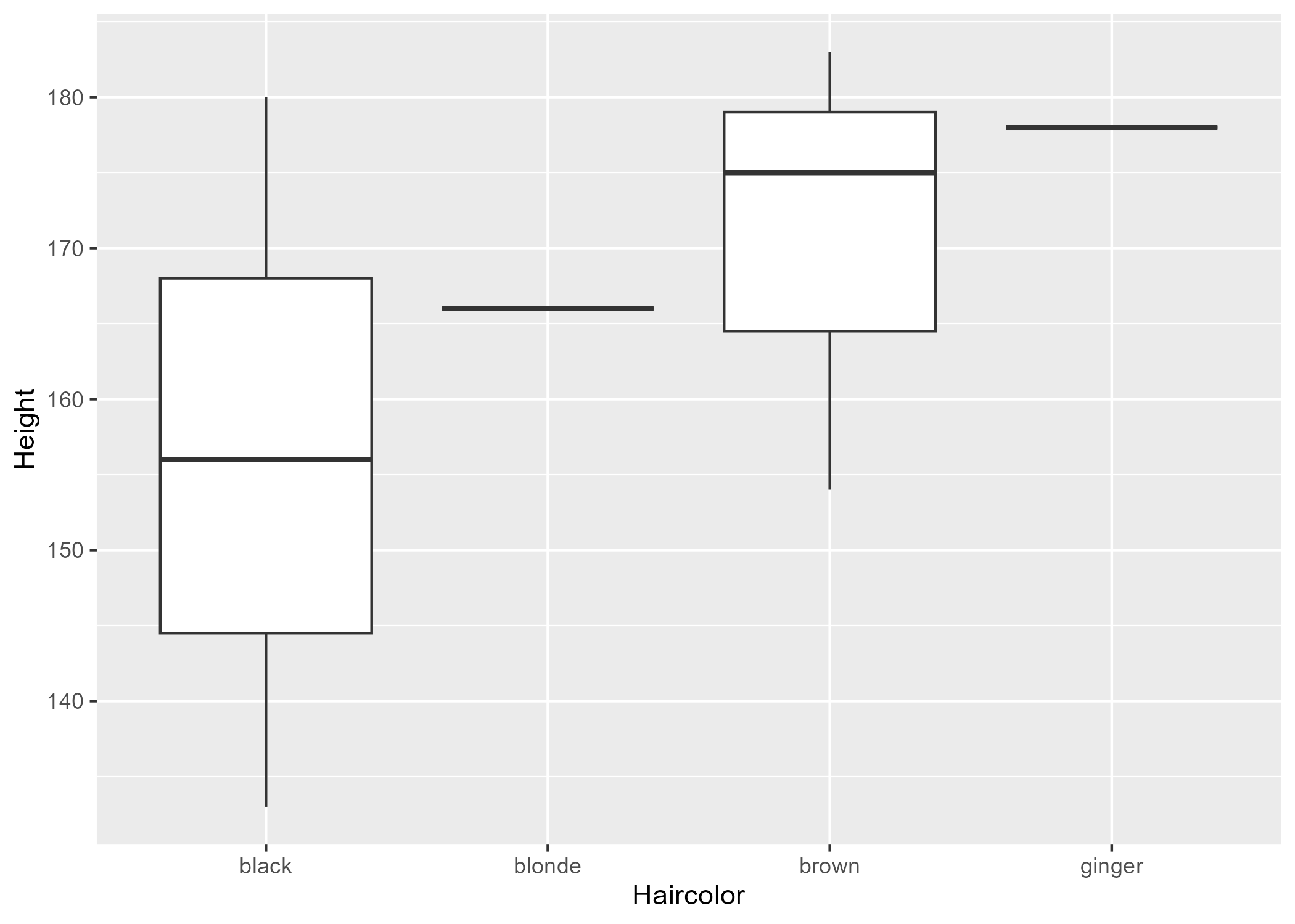 Cora produced a box plot displaying hair color versus height. Because there were one ginger and two blondes, of the same height, the box plot is not evenly distributed.