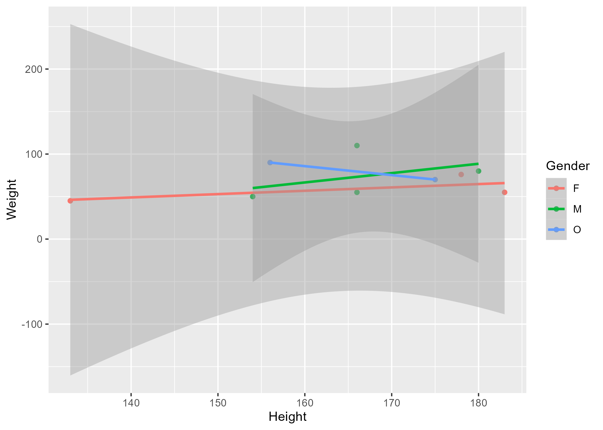 ~Figure 1. Weight (y axis) versus height (x axis) stratified by gender~